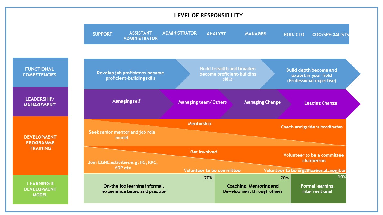 At every step of our employees’ careers we invest in them, and ensure their interests remain focused on the long term. Our goals are to maximize individual potential, reinforce the EGNC culture and expand our people’s professional opportunities As such, in line with the above objectives and in order to stay relevant, EGNC has created a Skills Framework called EGNC Competency Development Framework (EGNC CDF) as a means of defining IT core competencies for our staff and create roadmaps and learning and development plans where EGNC and our staff can recognize a pathway to success and improvement.