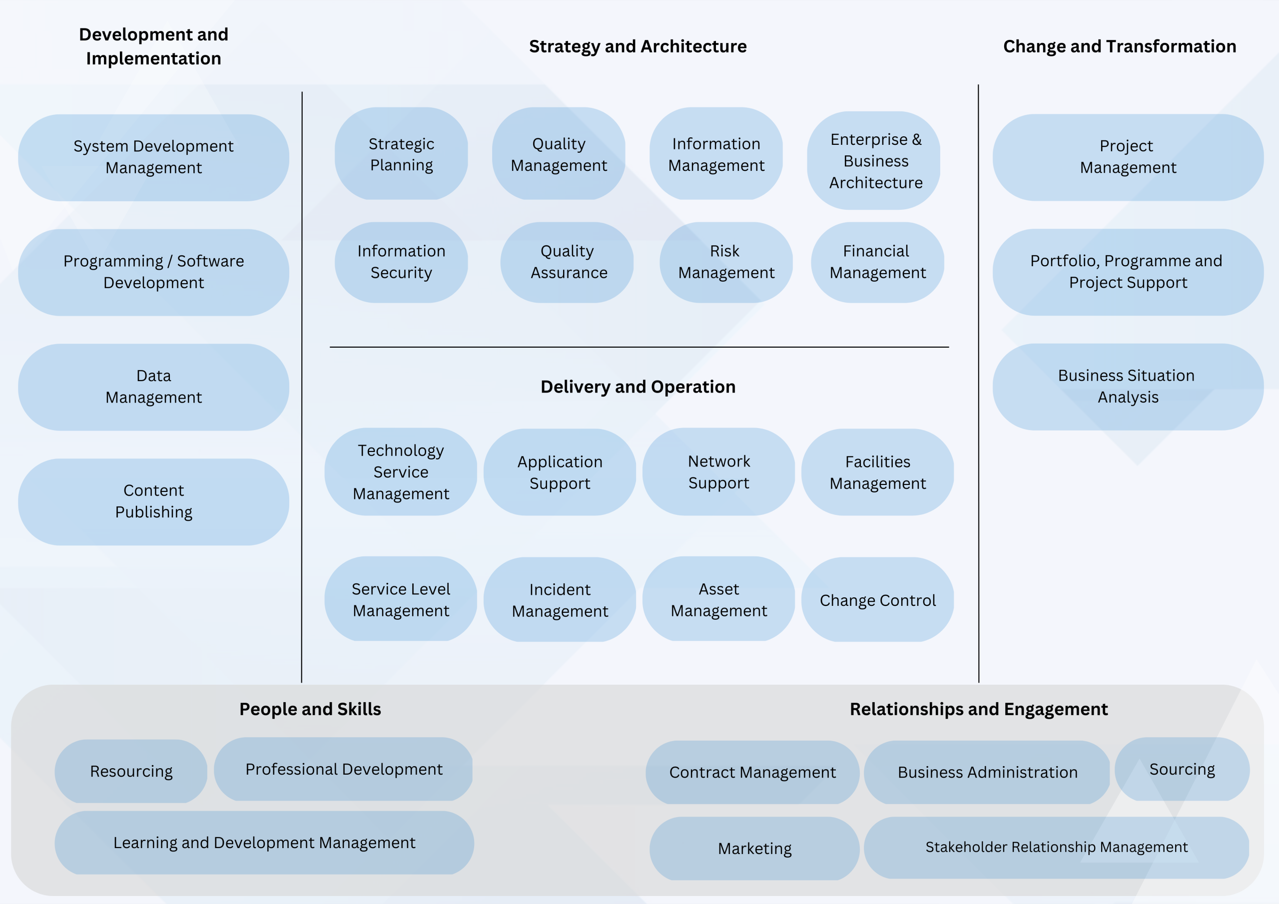 EGNC CDF was developed with input from the BCS Skills for the Information Age (SFIA) and our employees to define and illustrate the skills and knowledge required to perform duties defined under their IT job roles as well as the support systems necessary for effective learning and development outcomes. It has been used by our employees to date to help guide their skills progression as well as plan out a tangible career pathway within the IT Scheme of Service.